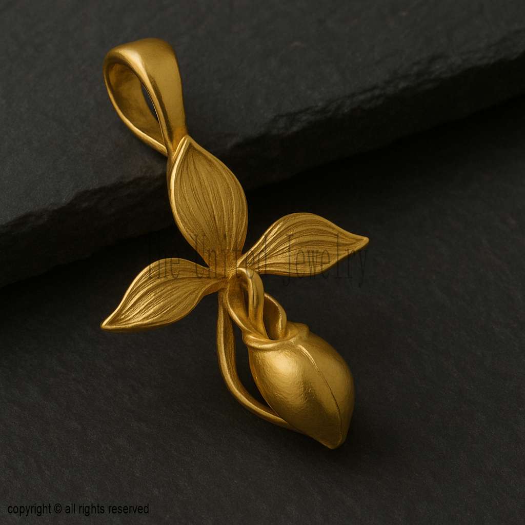 Inspired by the exotic beauty of the orchid flower, this elegant pendant is a symbol of love, strength, and luxury. Meticulously handcrafted in solid 925 sterling silver and plated with a rich layer of 18K gold vermeil, the piece captures the delicate curves and textures of a real orchid in full bloom.