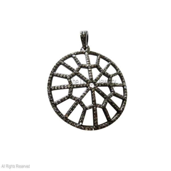 Gemstones: High-grade Pave-set Diamonds (or Brilliant White CZ) covering the entire framework. Design: Intricate geometric “Protective Seal” or web-inspired medallion with a radial symmetry pattern. Finish: Vintage Black Rhodium (Oxidized) plating for an antique, mystical appearance. Bail: Encrusted pave bail to ensure a continuous sparkle from chain to charm. Symbolism: Represents interconnectedness, protection, and the “Web of Life.” |