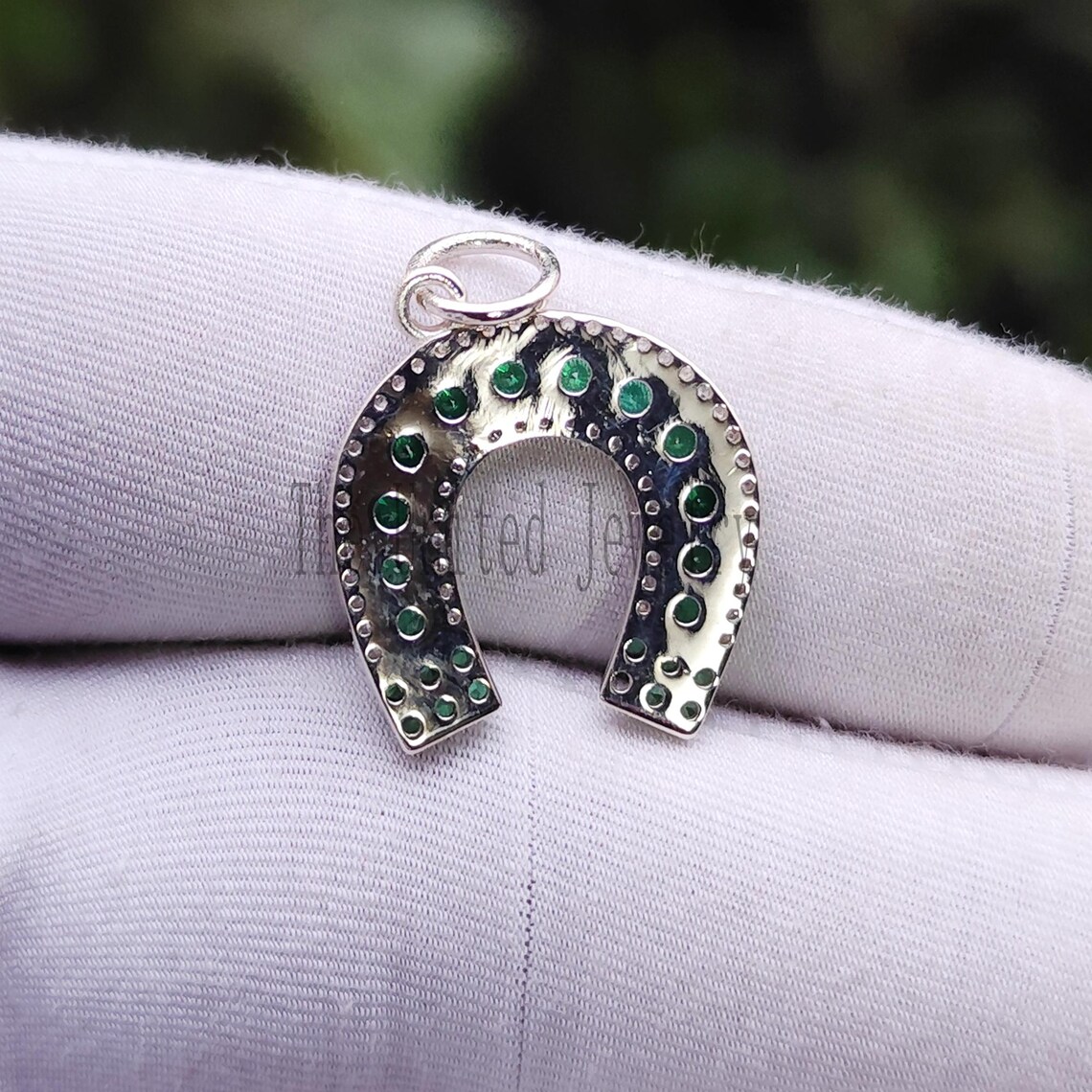 Lucky Horseshoe Charm In 925 Sterling Silver With Diamonds And Emeralds, Silver Handmade Horseshoe Charm Jewelry For Women’s