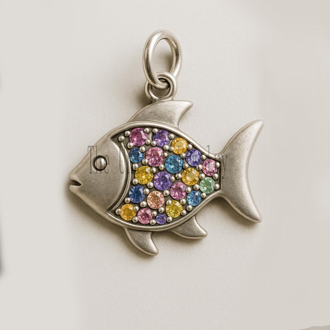Dive into whimsical elegance with this handcrafted sterling silver fish pendant, adorned with a vibrant array of multi-colored sapphire gemstones. This charming nautical-inspired piece brings a splash of color and sparkle, making it a perfect gift for ocean lovers, summer fashion enthusiasts, or anyone who adores unique gemstone jewelry.