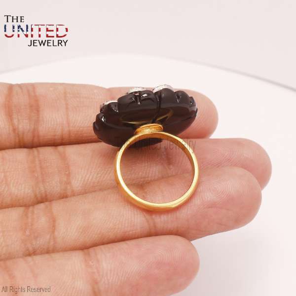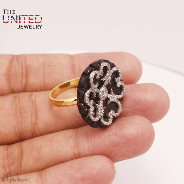 Style: A bold, vintage-inspired statement ring that combines dark elegance with feminine floral details.