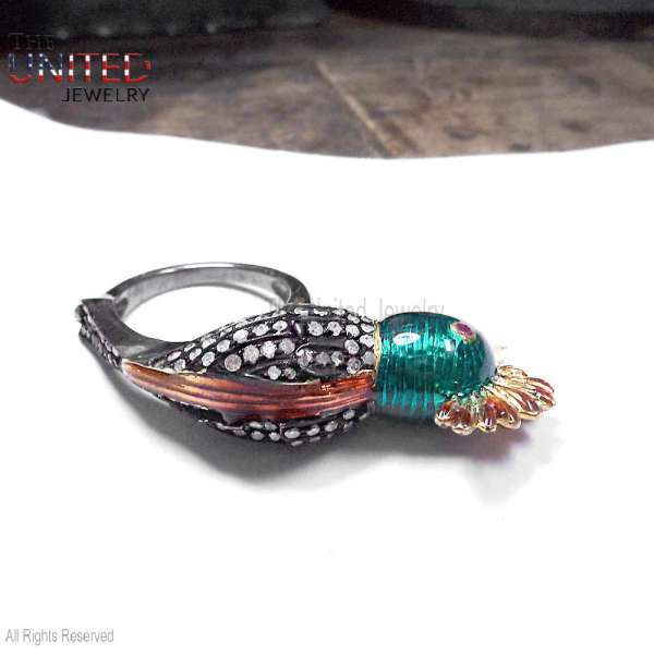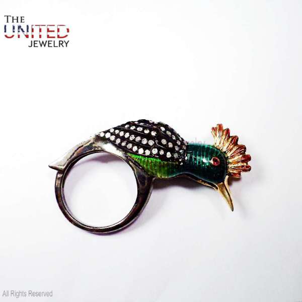 Handmade 925 Sterling Silver Enamel Hoopoe Bird Statement Ring