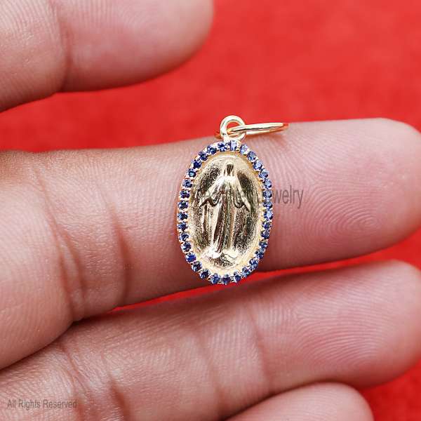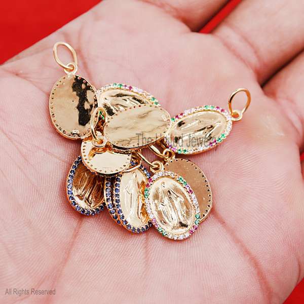14k Gold Miraculous Medal with Multistones Charm, 14k Gold Mother Marry Charm, 14k Gold Christ Charm Pendant
